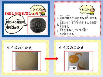 給食時間が楽しくなるように「クイズ」をすることもあります。今日は,何という野菜の切り口かな?という問題を出しました。切り口のシルエットとヒントから「たまねぎ」が正解だとわかったようです。『豚肉ととうふのくず煮』に入っていましたね。