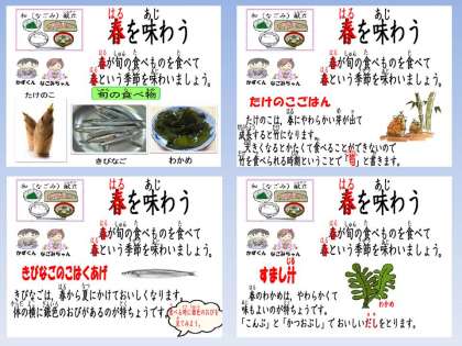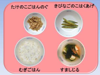 4月の『和(なごみ)献立』が5月2日だったこともあり,「たけのこ」や「わかめ」が旬の食材だということはよく知っていました。今月は,『きびなごのこはくあげ』が魚料理なのにカリカリに油で揚げてあって,1年生にも人気でした。「きびなご」の特徴である体の銀色の帯を見つけて「あった。あった。」と喜んでいました。わざと「にがくなかった?」と聞いてみたら「にがいのすきやもん。」とちょっぴり自慢げです。「へぇ 大人みたいだね。」と言うと はにかんで笑っていました。