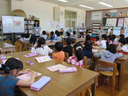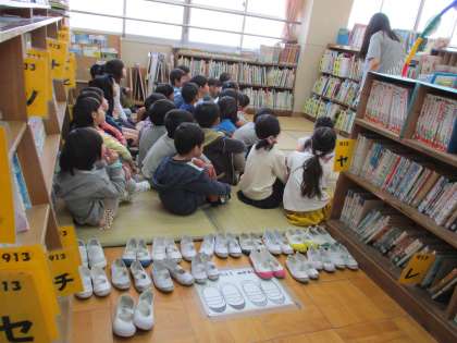 今日は図書館の使い方を学びました。本の借りかた,返しかた,部屋では静かに過ごすことなど,真剣に説明を聞く子どもたちです。