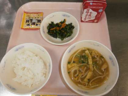 気温が平年より低く,あたたかい『カレーうどん』は,体が温まりました。またツルツルッと食べやすいこともあり 時間内に食べ終わる子どもがとっても多かったです。