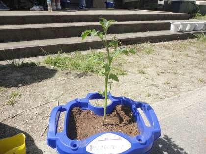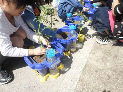ミニトマトの苗植えをしました。「さあ,そだてるぞ」と,優しく丁寧に苗植えをしました。「そうっと,そうっと」を合言葉に苗を植えることができました。