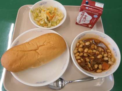 今日の給食は,鉄を多く含む「大豆」を使った『大豆と牛肉のトマト煮』でした。