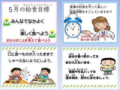 今日は,「まわりのことを考えながら食べよう。」のテーマで,口の中に食べ物が入っている時はおしゃべりせずに食べること,食器や牛乳パックの返却も静かに落ち着いて歩くことを確認しました。