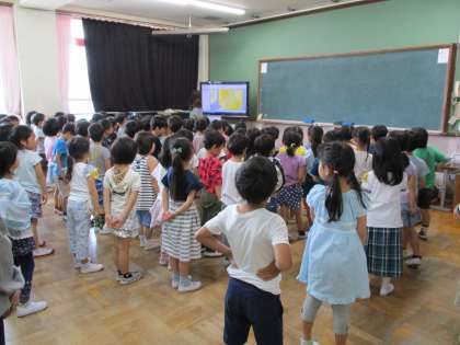 今日は1年生を迎える会がありました。朝から元気いっぱいの1年生は,ワクワクしながら今日の歌を学年で最終調整しました。6年生が迎えに来ると,仲良く手をつないで体育館へと向かいます。