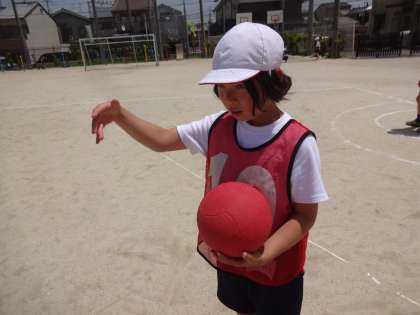 高学年のバスケットボールにむけて,動かない的めがけてシュートを決めます。
