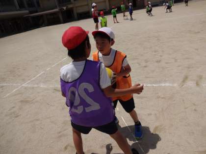 うまくボールを前に進めるために,班で作戦をたてることができました。