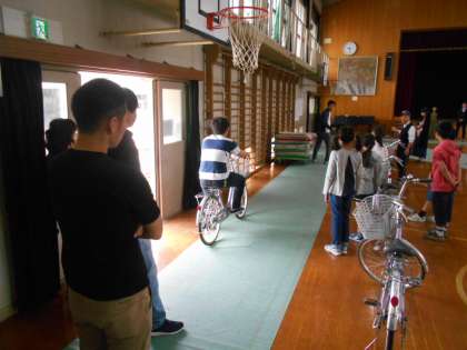 練習では,声を出しての周囲確認や走行指示,ジグザグ運転などを行っています。交通安全推進委員の方や多数の教職員も参加する中,子ども達は楽しく熱心に練習をしています。