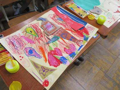 図工科「いろいろなかたちのかみから」での一場面です。さまざまな形の紙からいろんな想像を浮かべ,画用紙に描いていきます。子どもたちの楽しそうな笑顔と「これ,何に見える?」といった質問がこちらまでウキウキした気分になります。