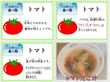 今から旬を迎える「トマト」を使って,小麦粉を練って作るだんごにもトマトの果汁を加えました。ピンク色のだんごでさわやかな酸味がおいしい『トマトだご汁』ができました。
