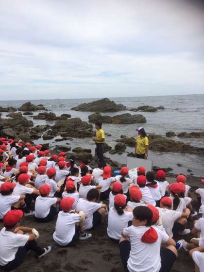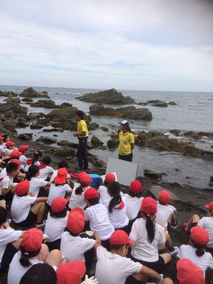 宮崎浜で磯観察を始めました。潮の満ち引きのお話を志摩マリンランドの方から伺っています。