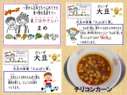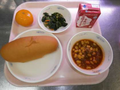 今日の給食は,昔から日本で食べられてきた食べ物「まめ」を使った『チリコンカーン』」でした。南アメリカの料理です。カレーの風味と少し甘めの味つけで低学年にもとても食べやすかったです。例によって1年生は,『チリコンカーン』という名前に少し慎重になったものの なんと 食べてみると「おいしい」とわかり,全校の残菜は470gでした。中学年1人155gの出来上がりだったので,残りは3人分ということになります。ちなみに,今日の伏見南浜小学校の欠席は7人でした。