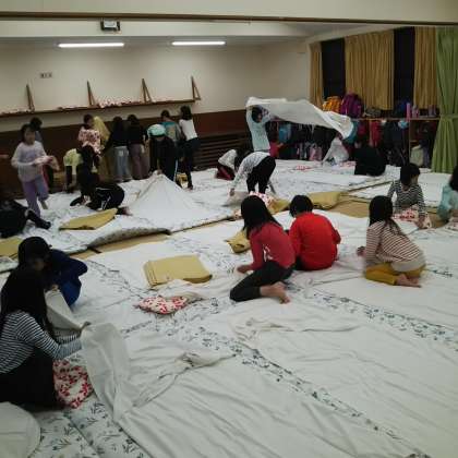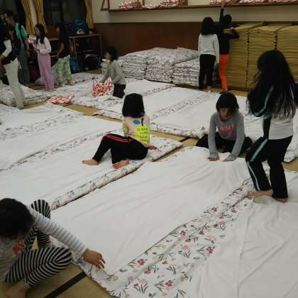 ぐっすり寝て今日の疲れを取るために,みんなで協力して寝具の準備をします。