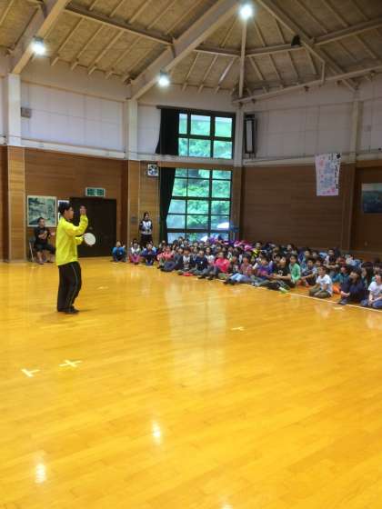 プレイホールでの活動が始まりました。みんなでレクレーションです。まずは,テーマソング「みさき色」を熱唱です。