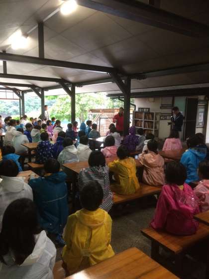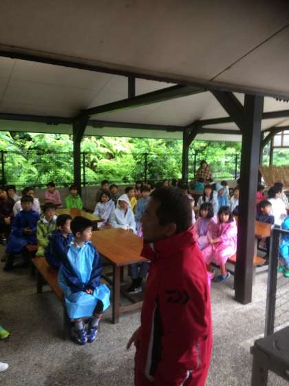 かご漁・生き物観察の活動が始まり,所員さんの説明を受けています。餌を投入して,後で引き揚げます。どんな生き物が見られるかな。