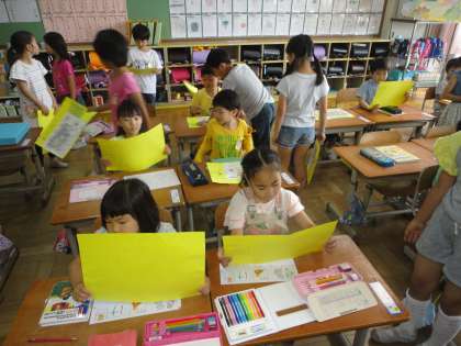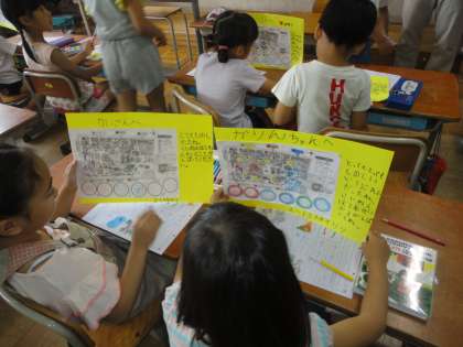 校外活動も無事に終わり,スタンプカードにメッセージを書いて1年生にプレゼントしました。1年生の喜ぶ顔を思い浮かべながら気持ちを込めて作りました。