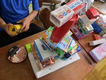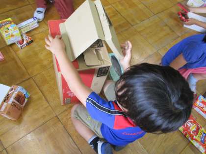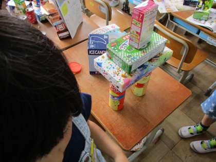 図工科「いろいろなはこから」の学習で,子どもたちは学校に持ってきた箱から様々なものを生み出しています。何ができるかワクワクさせられる一場面です。