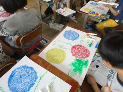 初めて絵の具を使った学習をしました。パレットやバケツ,筆の使い方など。たくさんのことを学習しました。その後,紫陽花に色付けをしていきました。水で薄めたり,白を混ぜてみたりと,色の違いを出しながら仕上げていきました。