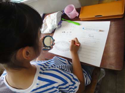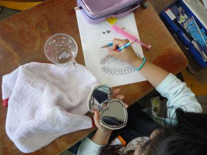 今日はカラーテスターを使って歯磨き指導をしました。正しい歯ブラシの持ち方や磨き方,日々の歯磨きを振り返りながら磨きの残しを確認しました。「前歯が真っ赤や」「歯と歯の間が赤い」など,手鏡を見ながら磨き残しを改めて感じていました。