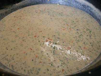 『チャウダー』は,スープの一つですが,シチューのように手作りのルーを作ってとろみをつけます。不足しがちな栄養をとるためにミックスビーンズ(手亡豆・枝豆・金時豆・大豆)を入れました。なんといっても色取りの良さは,パセリの葉の緑色ですね。