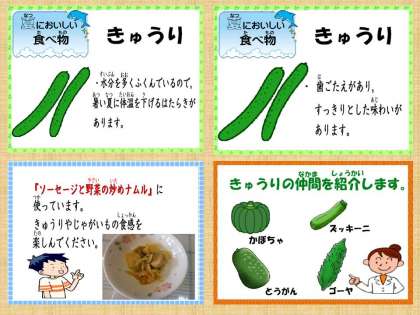 給食カレンダーや電子紙芝居「給食室からこんにちは」で,夏においしい食べ物「きゅうり」について紹介しました。水分を多く含み暑い夏に体温調節をしてくれます。歯ごたえがよく,すっきりした味わいがあります。子どもたちは,コリコリシャキシャキとした歯ざわりと食感を楽しんで食べていました。