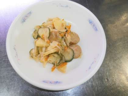 今日の給食は,ソーセージとじゃがいもを素揚げにして,にんじんやきゅうり,蒸したキャベツを一緒に炒めて,合わせ酢とごまで味付けした献立『ソーセージと野菜の炒めナムル』にしました。
