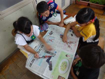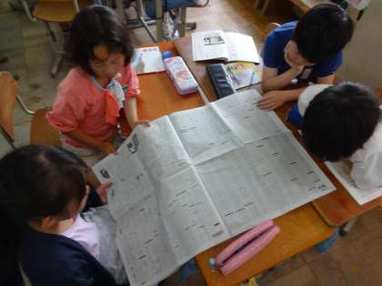 班で新聞を見ながら,気づいたことを交流します。
