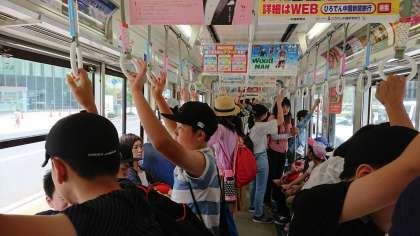 広島駅から平和記念公園に向けて,「広島電鉄」で移動しています。車内は少し混んでいるようですが,路面電車に乗るということで,わくわくしている子どもが多いようです。