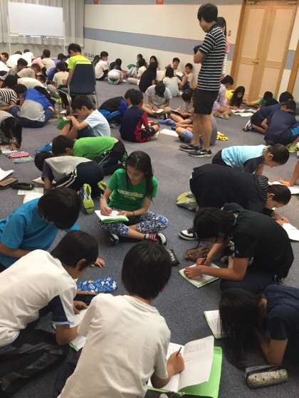 お風呂に入ってさっぱりした後,お土産も買って大満足。午後9時からは今日の振り返りをしました。平和記念館で語り部さんのお話を聞いて,家族と一緒に居られることや美味しいご飯を食べられることの幸せを感じたこと,当たり前の平和な毎日に感謝して生きたいこと,戦争は絶対してはいけないと強く思ったことなどが出されました。そして,これからは自分の苦手なことにも挑戦したい,友達と協力して楽しく,時には厳しく過ごして行きたいという決意などが語られました。 自分たちの日常をしっかりと見つめるとてもよい振り返りの時間になりました。
