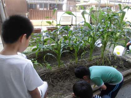トウモロコシはぐんぐん背が伸びて花が咲き,ナスとシシトウは順次収穫していっています!
