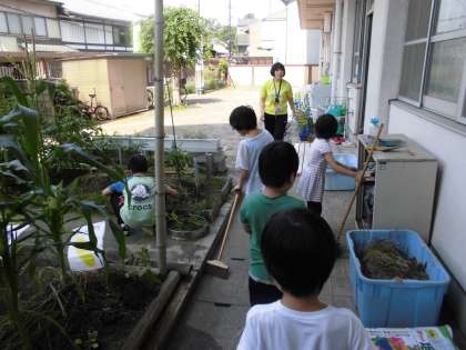 毎日水やりや草ぬきをしながら,野菜の生長を観察する子どもたちです。