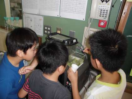 教室にもメダカの赤ちゃんを分けてもらい,みんな興味深そうに眺めています。