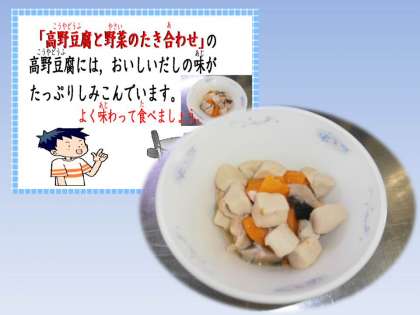 「こうやどうふとやさいのたきあわせをごはんといっしょにたべたらおいしかったです。」4年1組