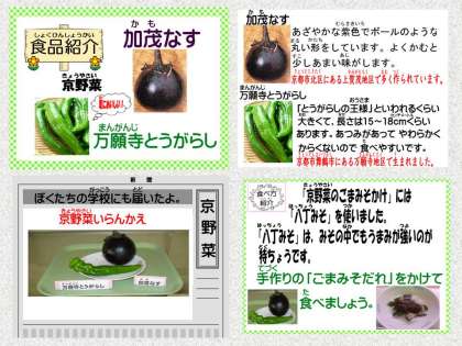 「どんな味がした?」という問いかけにも「にがいと思ったけど,甘かった。」とか「おみそがごはんと食べたらおいしい。」・「きらいやけどがんばれた。」と新しい発見もあったようです。京都の気候風土で生まれた「京野菜」,そこに住み育つ子どもたちにも一番適している「京野菜」を食べて,京都の暑い夏を元気に乗り切ってほしいと願っています。