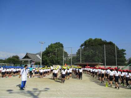 火曜日,きれいな晴天に恵まれ,全校練習をすることができました。たくさんの教職員,上級生に混じり,堂々と行進したり,体操をしたりする一年生です。