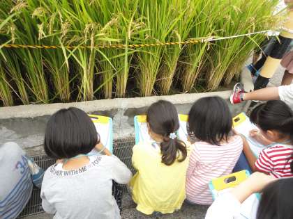 稲刈りに向けてお米の観察をしました。一粒一粒の大きさや形,手触りを感じながら子どもたちは真剣に取り組んでいました。今年はたくさんの強風・強雨に耐えてきたお米たち。美味しく育ってくれることを心から願っています。