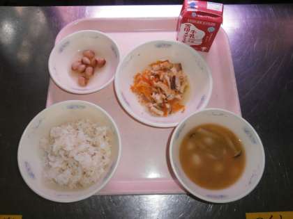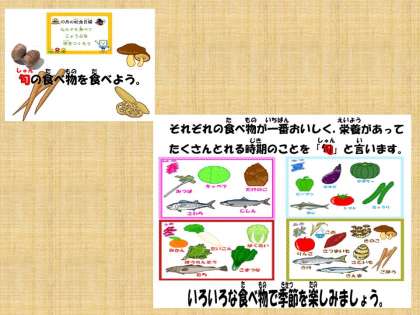 汁物は,旬の「ごぼう・しめじ・さといも」を使って『いものこ汁』にしました。旬の食べ物は,一年で一番おいしく,栄養価が高く,たくさん取れるので価格が安い,という利点があります。食べ物の旬の良いところを学び,おいしくいただきました。