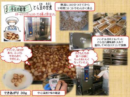 「とら豆」を朝から熱湯に30分つけた後,コトコトとじっくりやわらかくなるまで煮ます。やわらかくなった「とら豆」と調味液をハンドル付のホテルパンにクラス毎に入れてカートごとスチコンにセットし,40分間加熱すると, ふっくらとやわらかく やさしい甘さの『とら豆の甘煮』に仕上がりました。しばらく置いて粗熱を取っている間に,さらにおいしくなりました。