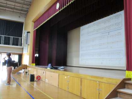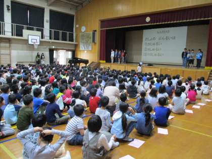 今日は児童朝会がありました。図書委員会の発表の後,メロディタイムで「みんなだいすき」を歌いました。口の開け方や声の響かせ方を学習し,日に日に歌声に自信があふれています。
