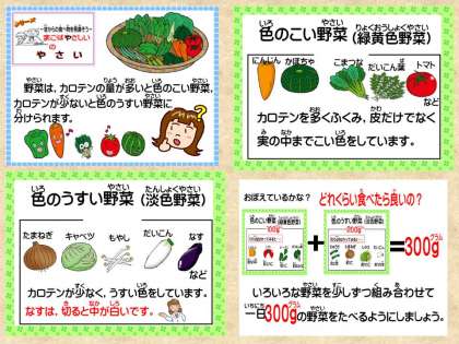 電子紙芝居「給食室からこんにちは」を見ながら,今日の色のこい野菜は何かな?色のうすい野菜は何かな? 探しながら食べました。色のこい野菜は,「にんじん・小松菜・トマト」色のうすい野菜は,「キャベツ・たまねぎ・コーン」でした。