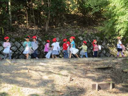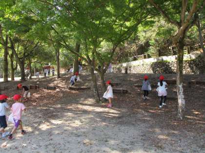ぽかぽか暖かい日差しの中,子どもたちは秋見つけをはじめました。どんぐりや落ち葉など,上や下をじっくりと見ながら探索をしています。
