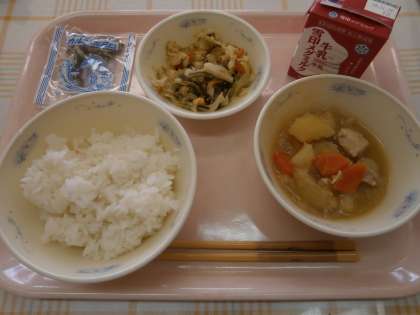 今日の給食は,主菜には,鶏肉を使って『鶏肉と野菜の煮つけ』,副菜には,野菜をスチコンで蒸して『ごま酢煮』でした。よくかむ献立『じゃこ』もつきました。