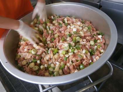 今日は,今が旬の「白ねぎ」を使って実施しました。スチームコンベクションオーブンの中の熱の回りがよくなり,ふっくらジューシーに仕上がるように,585人分を3回に分けて焼きました。