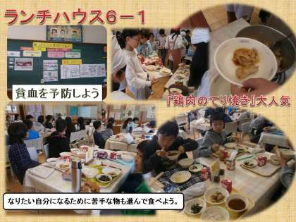 一緒に給食を食べた6年生は,食べ物のはたらき「赤・黄・緑」から家庭科で学習した5大栄養素を思い出し,その中の無機質の一つ「鉄をとることの大切さ」について考えました。