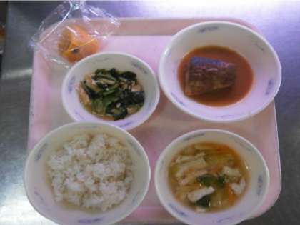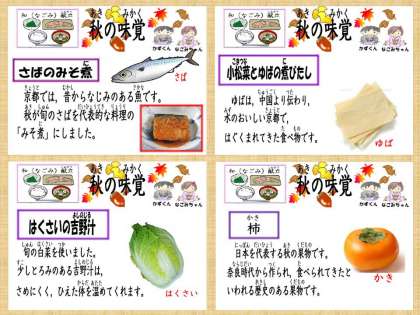 メニューは,秋に一番脂がのっておいしくなる「さば」を使って『さばのみそ煮』,水のおいしい京都で育まれてきた「ゆば」を使った『小松菜とゆばの煮びたし』,朝晩の冷え込みでおいしくなり,今から旬をむかえる「はくさい」を使って,体を温めてくれる『はくさいの吉野汁』,デザートには,奈良時代から食べられてきた,日本を代表する秋の果物『柿』でした。