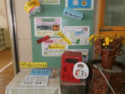 給食カレンダーや電子紙芝居「給食室からこんにちは」,和食推進(11月の「和(なごみ)献立」)に関するDVDを見て,和食について学びました。その成果として「なごみクイズ」に挑戦しなごみ博士を目指します。