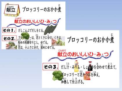 副菜には,秋から冬が旬で花(つぼみ)の部分を食べる「ブロッコリー」を使って『ブロッコリーのおかか煮』にしました。