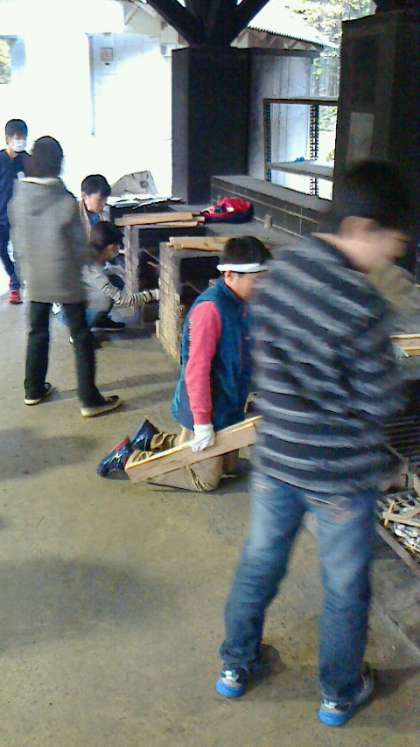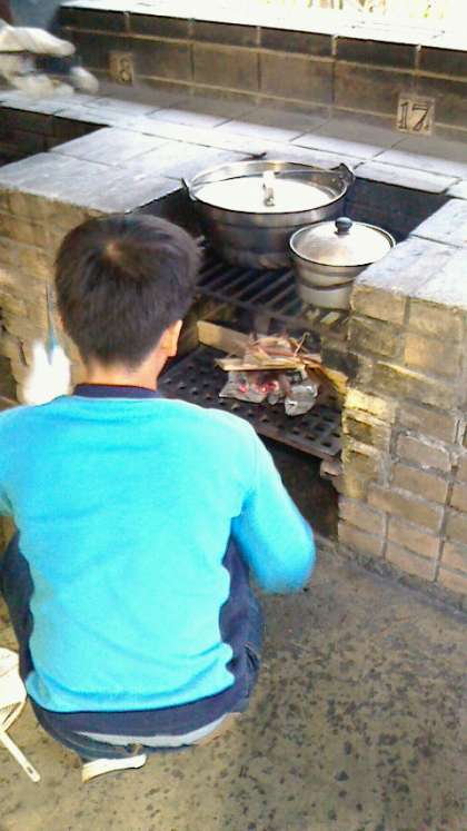 かまどに火をつけたり,火加減を調整したり,難しいようですが頑張っています。