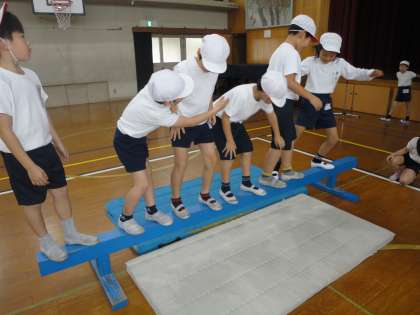 「平均台」です。バランスを保ちながら,立ち位置を入れ替える工夫をしました。