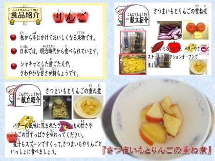 「りんごがシャキシャキしていておいしかったです。さつまいものしるがあまくてついついおかわりしてしまいました。さつまいもが色あざやかで家ではたべられないはじめてのあじでした。あまさのおかげで,きらいなりんごの皮もたべられてうれしかったです。おいしいきゅうしょくいつもありがとうございます。」…4年3組