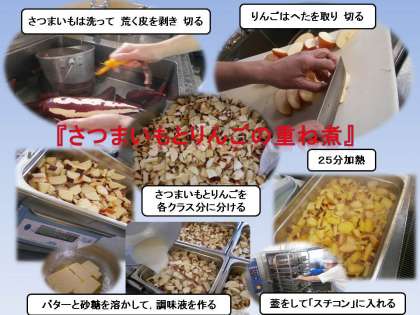 今日の給食は,今が旬の「りんご」と「さつまいも」を使って『さつまいもとりんごの重ね煮』でした。スチームコンベクションオーブンを使って彩りよく ほんのり甘くておいしい『さつまいものりんごの重ね煮』ができあがりました。見た目の色どりも大切な「おいしさ」のポイントになるので,皮の剥き方,厚みなども事前に検討し,調理時間も20分を予定していたのですが,5分の延長でしっとりと軟らかくやさしい甘味と酸味が感じられる『さつまいもとりんごの重ね煮』ができあがりました。